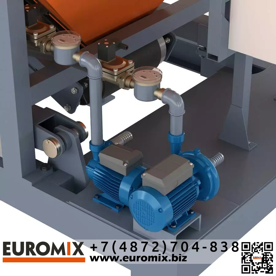 Завод оборудован одним бункером для хранения инертных материалов с ленточным питателем, который подает материалы в роторный смеситель. Смеситель установлен на тензодатчиках, которые позволяют точно взвешивать как инертные материалы, так и цемент. Водоснабжение и добавление жидких компонентов осуществляется через объемные дозаторы, обеспечивающие точное дозирование. Система управления завода включает автоматический и ручной режимы, что позволяет как полностью автоматизировать процесс производства, так и вручную контролировать каждый этап.