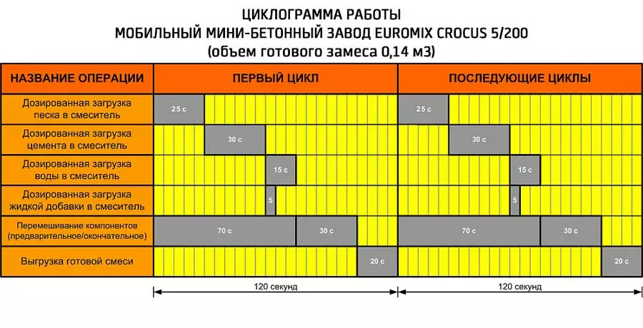 Производительность завода достигает 3-4 м³/час, при этом за один цикл, который в среднем занимает 90 секунд, готовится около 130 литров смеси. Данная производительность позволяет оперативно обеспечивать строительные работы необходимым количеством бетона или строительного раствора.