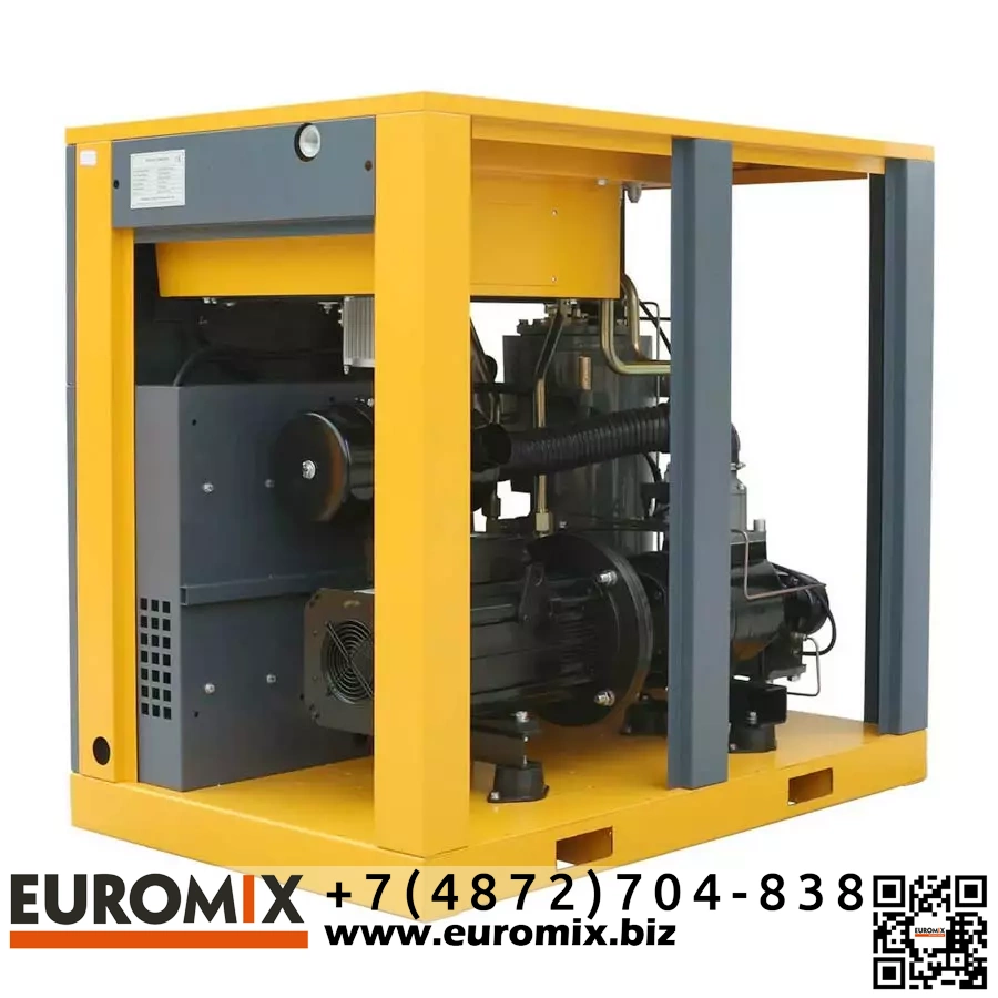 - Для поддержания оптимальной рабочей температуры винтового модуля реализована комбинированная система охлаждения с осевым вентилятором и алюминиевым радиатором увеличенных размеров. Лопастной нагнетатель оснащен независимым электроприводом.